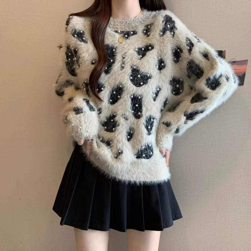 Autumn Winter Women's Mink Fleece Sweater Beaded Color Block Crew Neck Pullover Sweater Soft Warm Knit Top