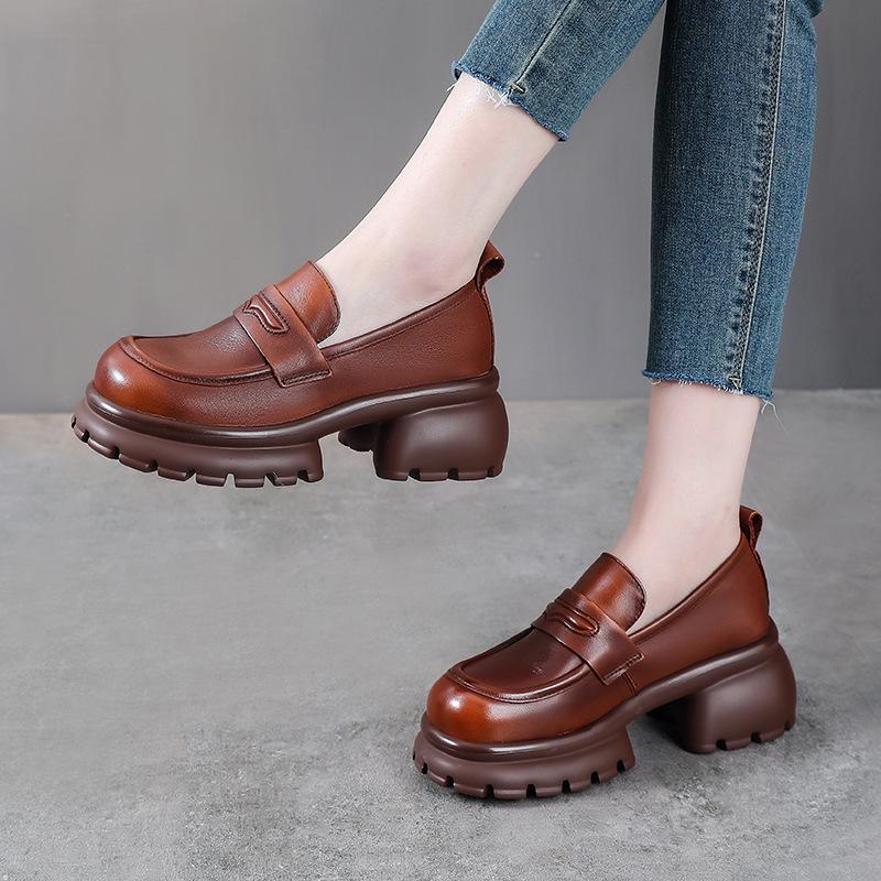 Women's Retro Cowhide Loafers with Thick, Soft Soles - Height-Increasing Leather Shoes for Spring and Autumn