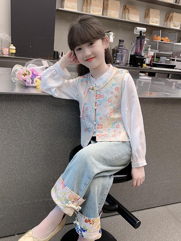 2025 Nowy Hanfu dla Dziewczynek: Modny Słodki Nadruk Chiński Trzyczęściowy Zestaw