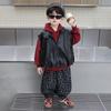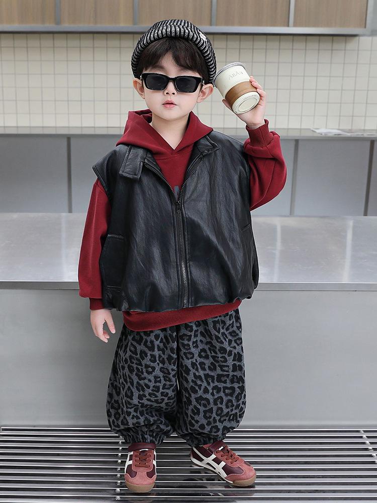 Ten stylowy trzyczęściowy zestaw streetwearowy jest idealny dla chłopców gotowych powitać sezon jesienny z polotem.. Ma modny design w stylu koreańskim, łącząc przytulną bluzę z kapturem z mieszanki bawełny z elegancką skórzaną kamizelką, tworząc nowoczesny warstwowy look.. Doskonale łącząc komfort i styl, ten zestaw jest idealny na codzienne wyjścia, zapewniając dziecku ciepło i modny wygląd.