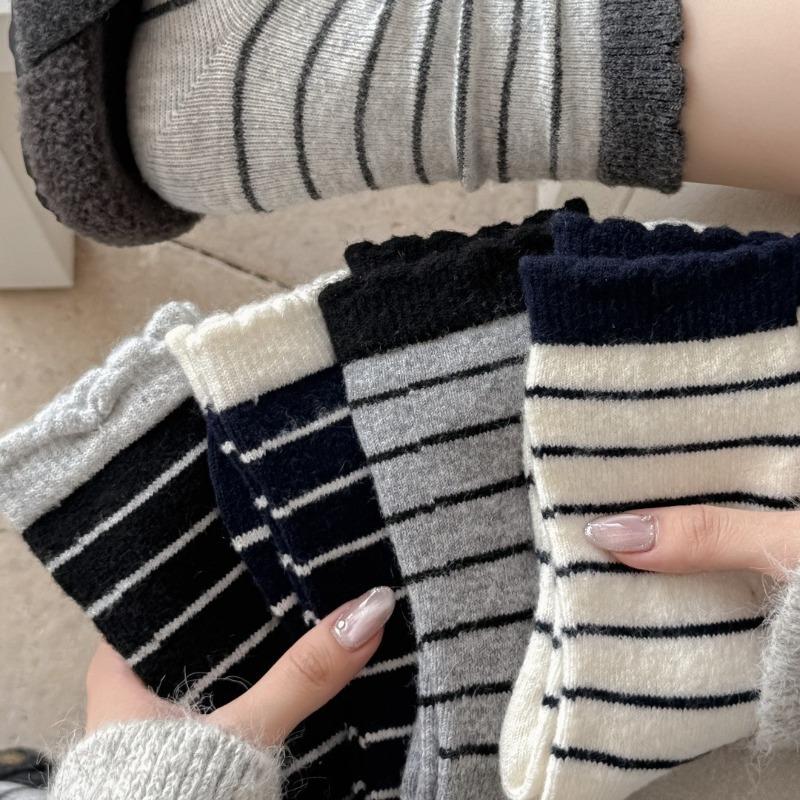 Striped Lace Wool Socks for Women, Mid-calf Socks for Spring and Autumn, Warm and Thick, Trendy Autumn Long Calf Socks
