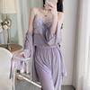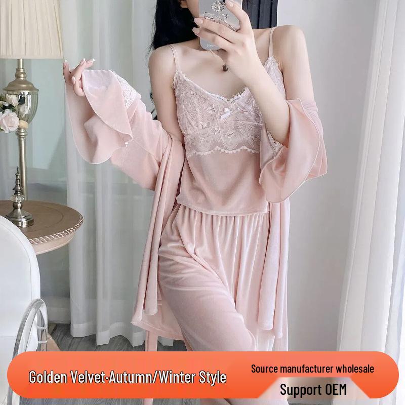 Zanurz się w luksusowym komforcie dzięki temu eleganckiemu trzyczęściowemu zestawowi zaprojektowanemu na jesień i zimę. Ten komplet składa się z bezrękawnikowej koszulki na ramiączkach, wykonanej z bogatego złotego aksamitu diamentowego, dodającego odrobinę luksusu do Twojej kolekcji odzieży domowej.. Uzupełnieniem koszulki na ramiączkach są długie spodnie wykonane z miękkiego, wysokiej jakości poliestru, zapewniające przytulne i dopasowane dopasowanie na chłodniejsze miesiące.. Idealny do wylegiwania się w domu lub na niezobowiązujące spotkania, ten zestaw bez wysiłku łączy styl i wygodę, co czyni go niezbędnym dodatkiem do garderoby każdej kobiety.