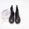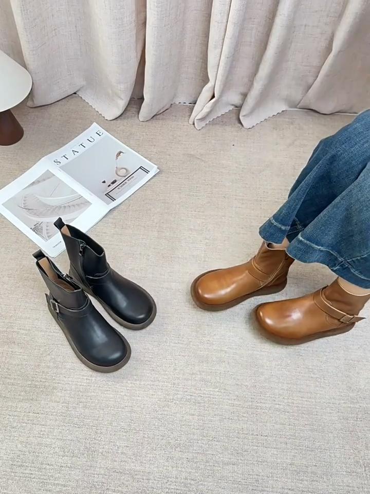 Johnature Retro Klamra Paska Skóra Naturalna Krótkie Botki Okrągły Nosek Boczny Zamek Płaska Podeszwa Damskie Botki