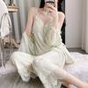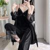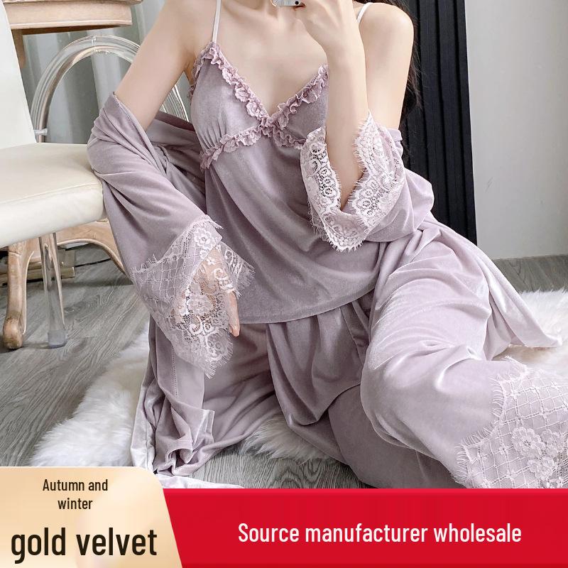 Golden Velvet Lace Nightwear Set: Sexy Camisole, Long Pants, and Robe with Breast Pads for Autumn/Winter Comfort.