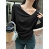 Top dzianinowy z dekoltem łódkowym, odkrywający ramiona, z długim rękawem, damski, jesienno-zimowy, z drapowanym kołnierzem, skośnym ramieniem, falbaną, dopasowany, warstwowy