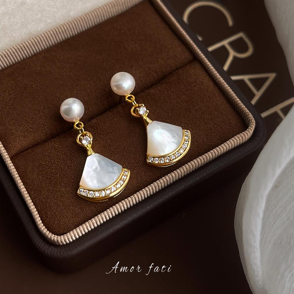 5A Grade Freshwater Pearl Fan-Shaped Mother-of-Pearl Earrings in 18k Gold
