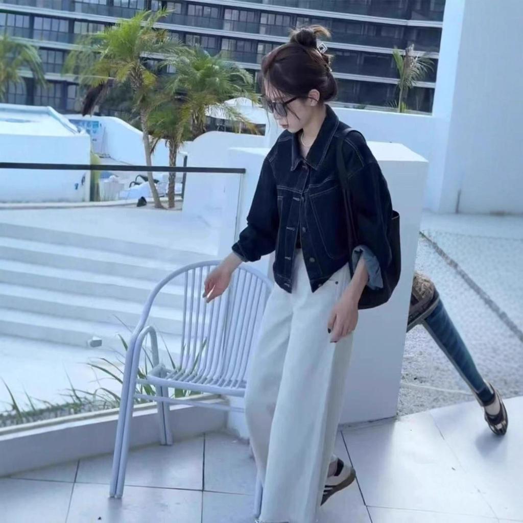 Deep Blue Short Denim Jacket for Women - Korean Style Slim Fit with Casual Pocket Design