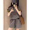 Women's Korean Style Casual Two-Piece Set: Striped Short-Sleeve Sweatshirt, Fashionable and Sporty, Slimming and Trendy.
