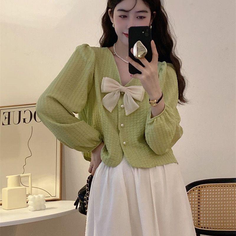 Pink V-Neck Puff Sleeve Bowknot Shirt - French Chic Women's Spring Top