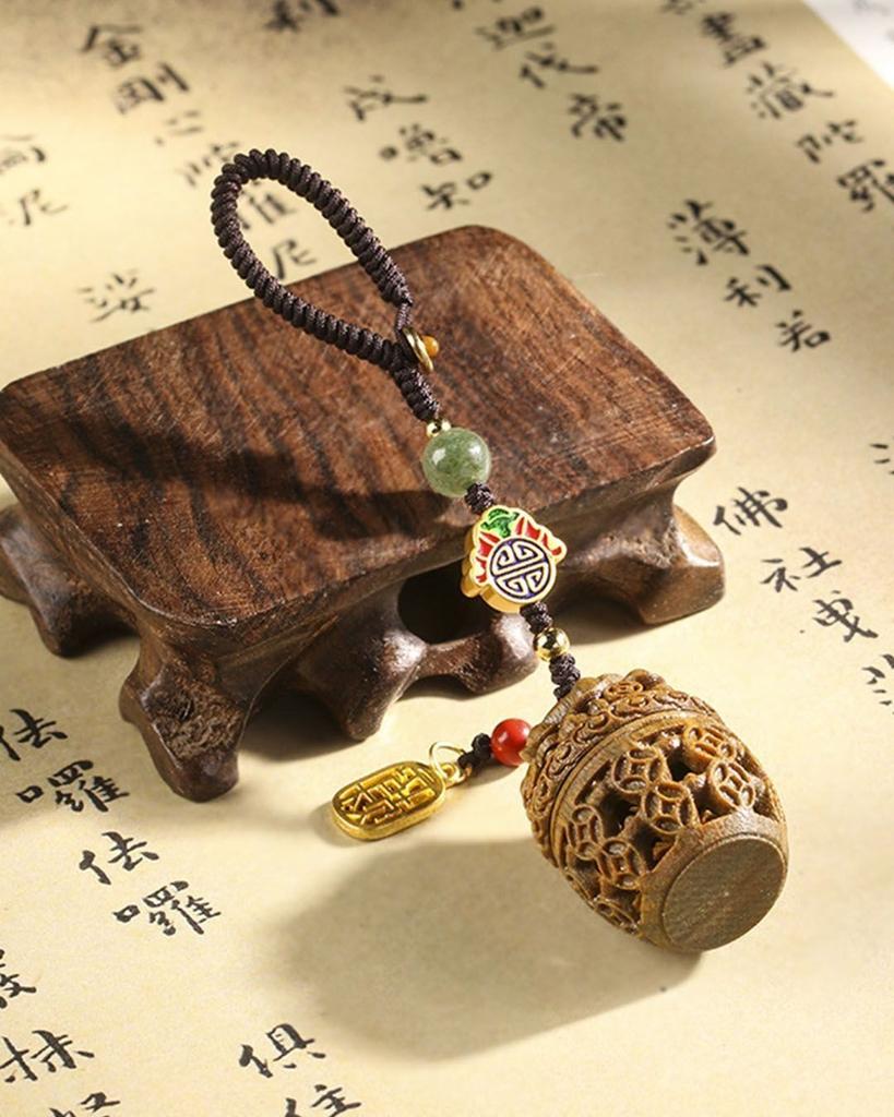 Zielony Sandalwood Skarbonka z Moneta Miedzianą, Ażurowe Rzeźbienie, Torba na Telefon Komórkowy, Brelok