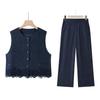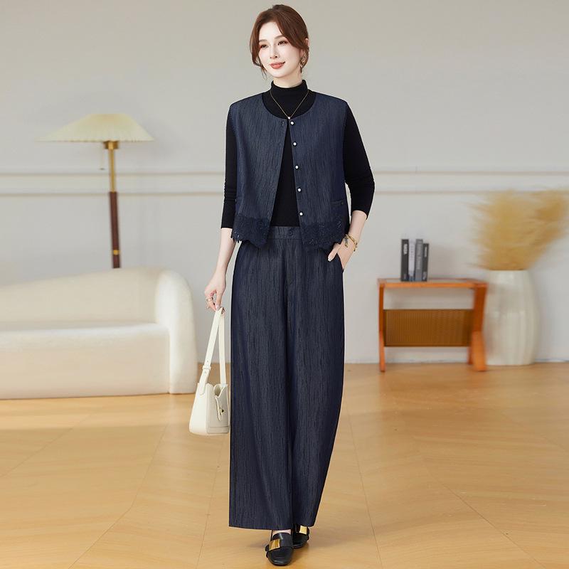 This elegant autumn fashion set is designed for mature ladies, featuring a sophisticated vest and wide-leg pants combination. Crafted entirely from high-quality polyester, the ensemble offers a sleek and comfortable fit perfect for the crisp autumn weather. The vest adds a touch of warmth and style with a plush polyester faux-fur lining, ensuring both comfort and chic flair. This stylish set effortlessly blends fashion with functionality, making it an ideal choice for any refined wardrobe.