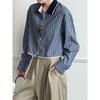 Ju Zhi Wczesnojesienny Retro Granatowy Paskowany Damski Luźny Top z Długim Rękawem