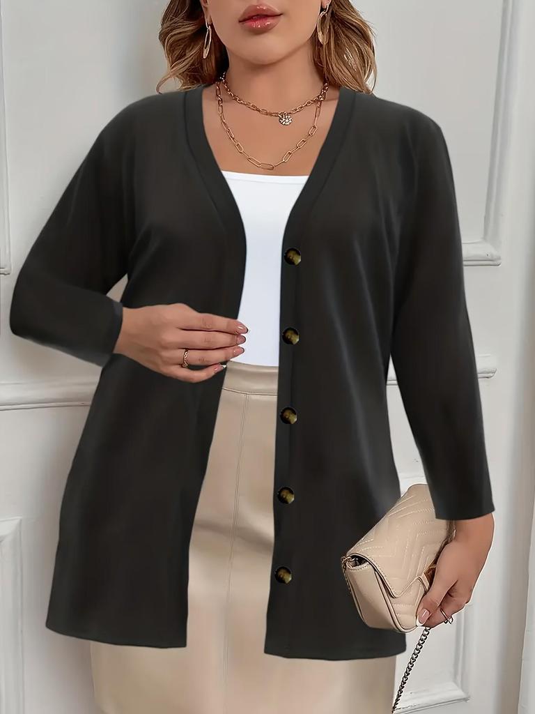 Ten elegancki kardigan doskonale łączy styl i komfort, zaprojektowany specjalnie dla kobiet plus size.. Ma jednolity wzór i jest wykonany z miękkiej dzianiny, zapewniając przytulne uczucie bez kompromisów w kwestii wyrafinowania.. Kurtka ma długie rękawy, zapewniające odpowiednie okrycie na chłodniejsze dni, oraz średnią grubość, co czyni ją wszechstronną opcją odzieży wierzchniej.. Wyróżniającym elementem designu jest jego pięcioprzyciskowe zapięcie, dodające odrobinę klasycznej elegancji każdemu zestawieniu.. Idealny zarówno na co dzień, jak i na bardziej formalne okazje, ten kardigan bez wysiłku dopełnia różne elementy garderoby.