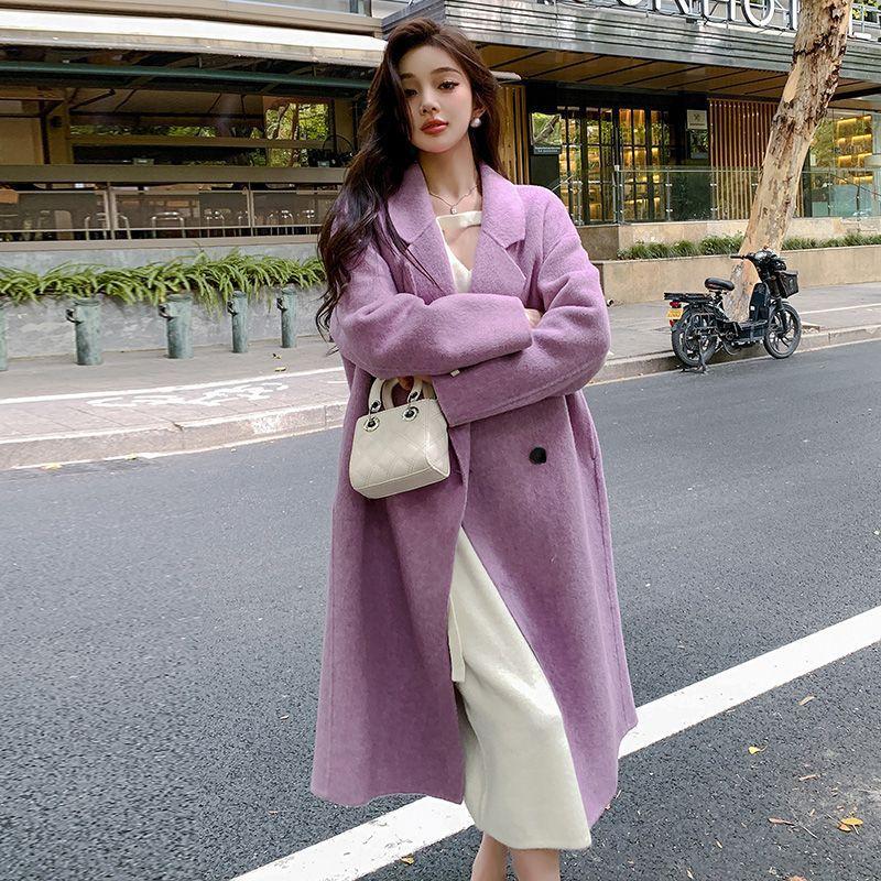 Fioletowy dwustronny płaszcz aksamitny dla kobiet jesień i zima nowy styl koreański średniej długości luźny wełniany płaszcz do kolan