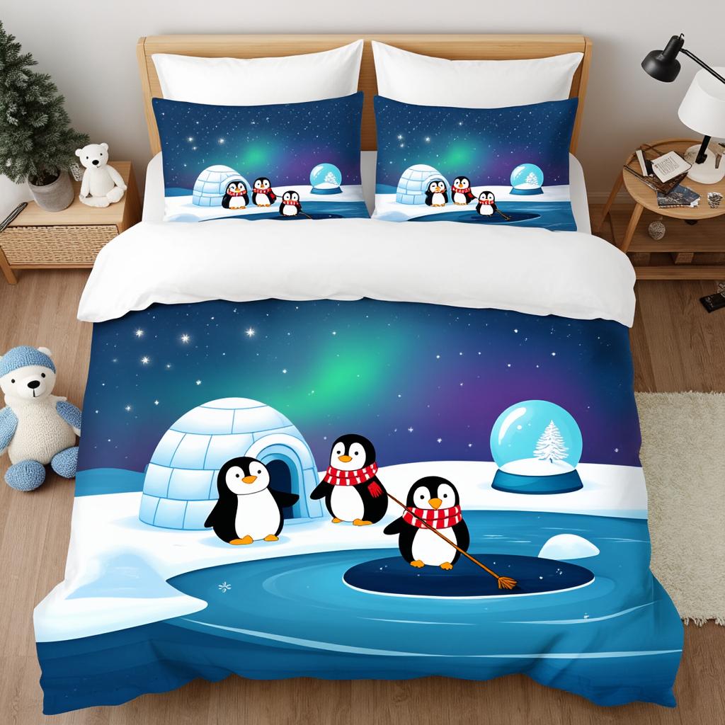 3Pcs North Pole Arctic Bear Penguin Bedding Set Polyester Soft Queen Size Kids Room Christmas Gift