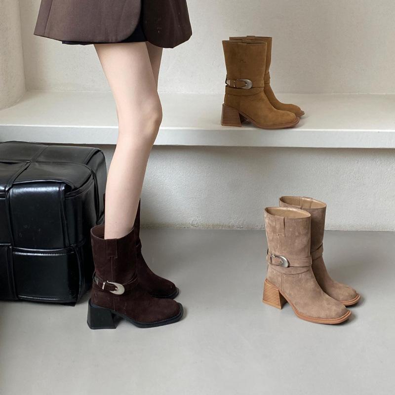 Korean version of thick heel heightening medium boots 2025 belt buckle small western boots women's autumn and winter loose pleated Martin boots