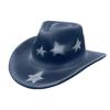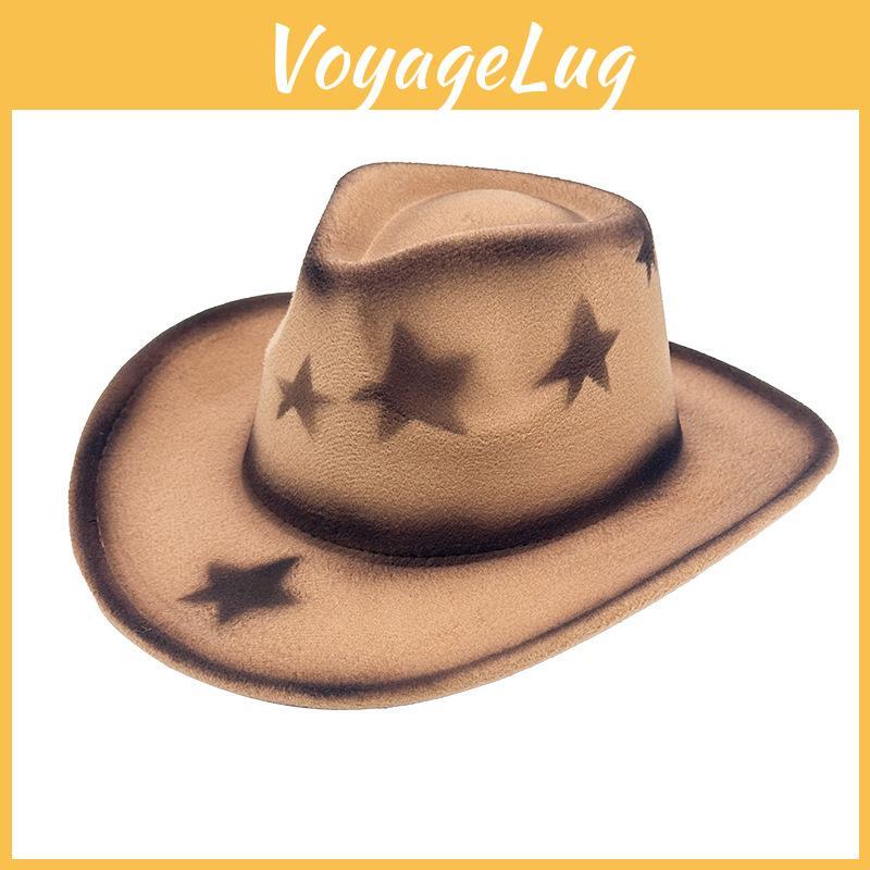 This cowboy hat features a wide brim and pinched crown, crafted from polyester wool blend for durability and breathability. Measuring approximately 22 inches in circumference size M: 56-58cm, it offers sun protection and insect resistance. Ideal for outdoor activities, it combines western style with artistic accents like star spray paint. Wipe clean with a damp cloth to maintain its appearance.