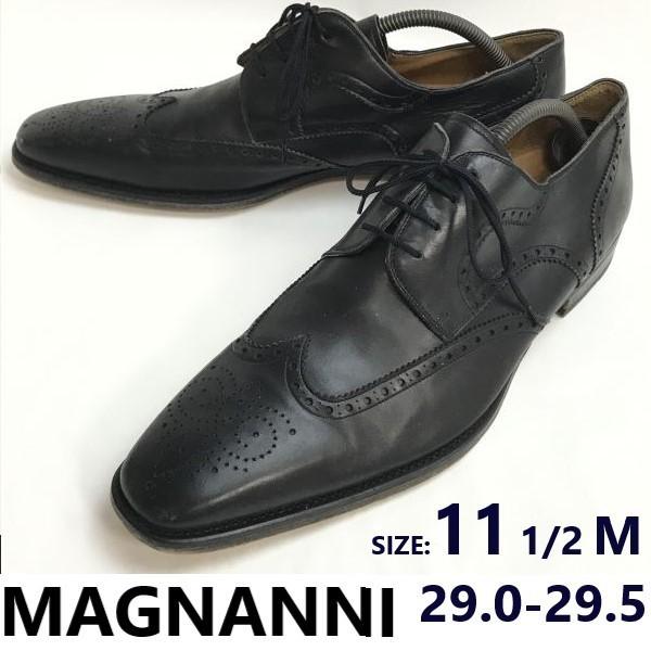 Stan bardzo dobry, wyprodukowano w Hiszpanii. Magnanni buty z prawdziwej skóry z długim noskiem i ozdobnym przeszyciem w kolorze czarnym. Rozmiar 11,5 (29,0-29,5). Buty biznesowe/wizytowe. [bi-172]