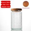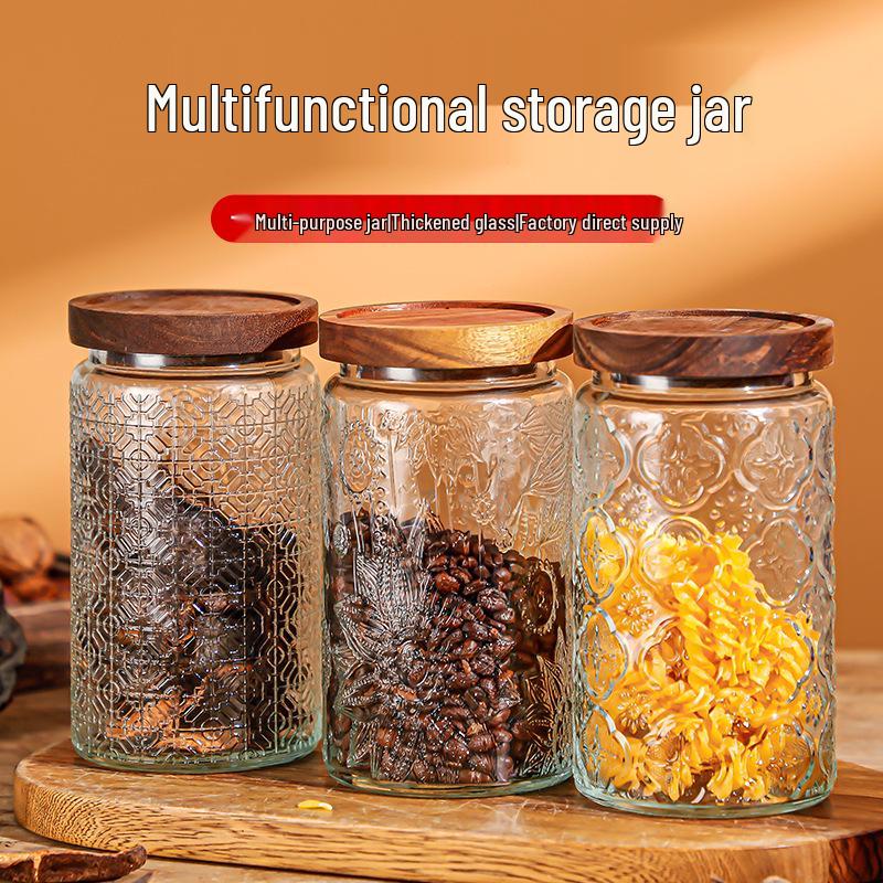 Cylindrical Embossed Glass Storage Jar with Wooden Lid for Dried Fruits and Grains