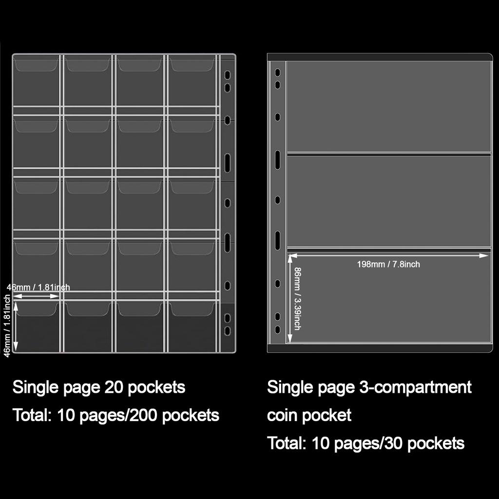Album na monety z 20 stronami, pojemny futerał z 200 kieszonkami na monety, 30 kieszonek na banknoty, monety groszowe, ćwierćdolarówki, znaczki
