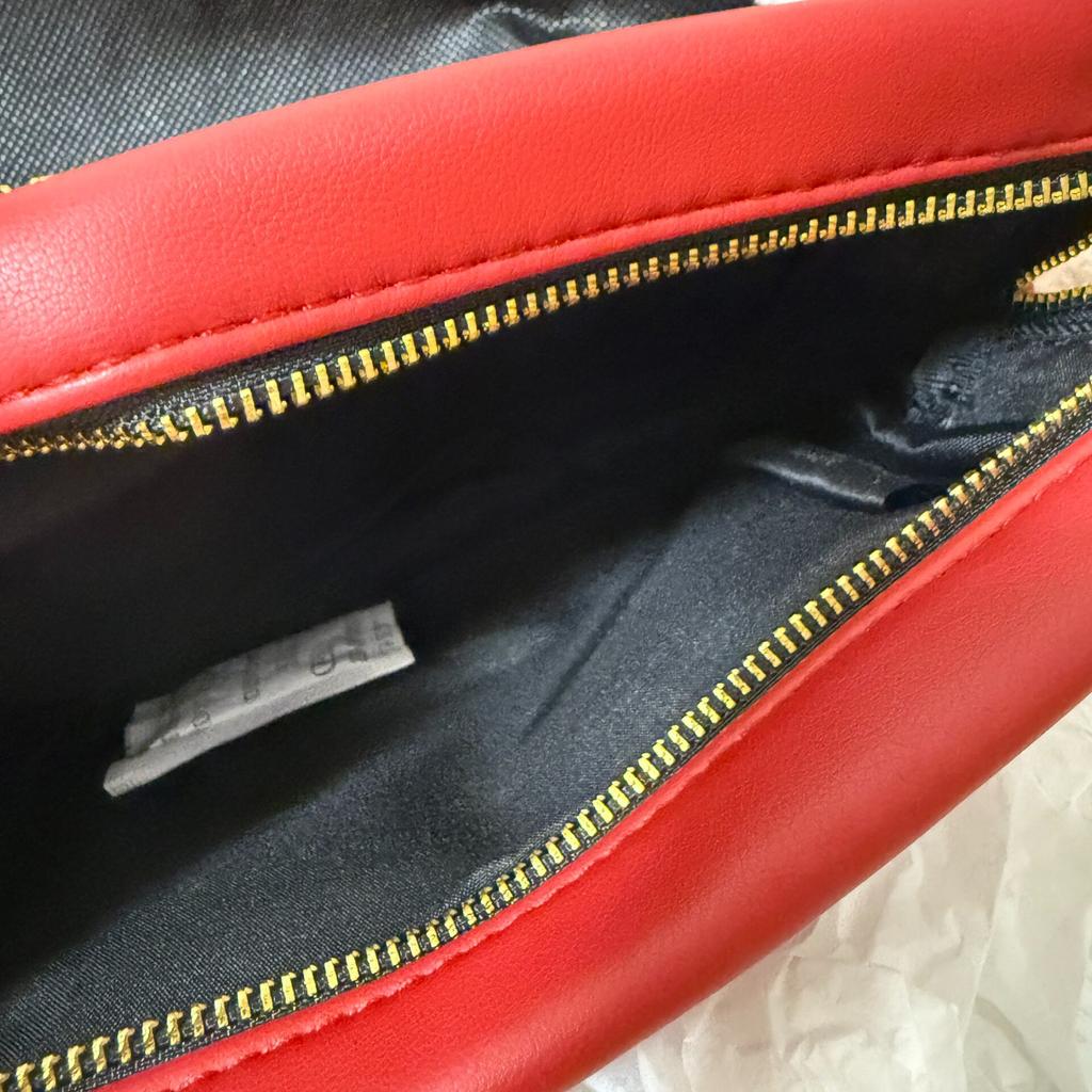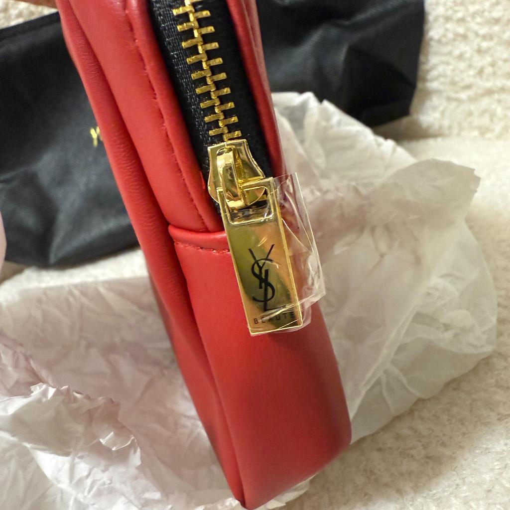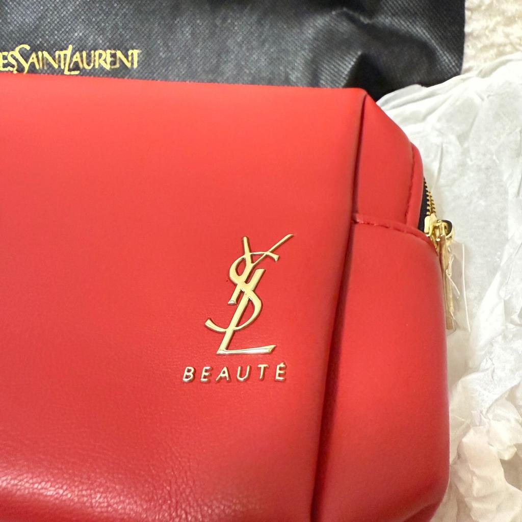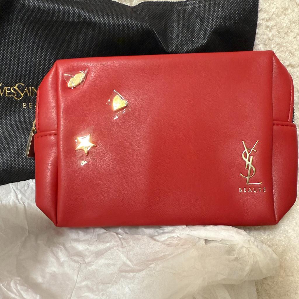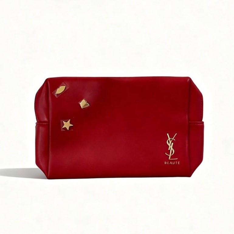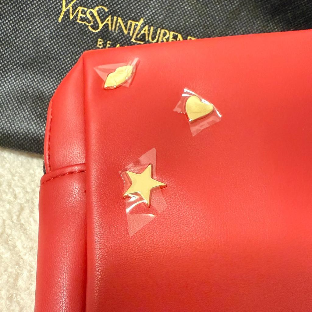 Czerwona kosmetyczka YSL z ozdobami w postaci złotych gwiazdek, damska podręczna kopertówka, organizer na codzienne niezbędniki