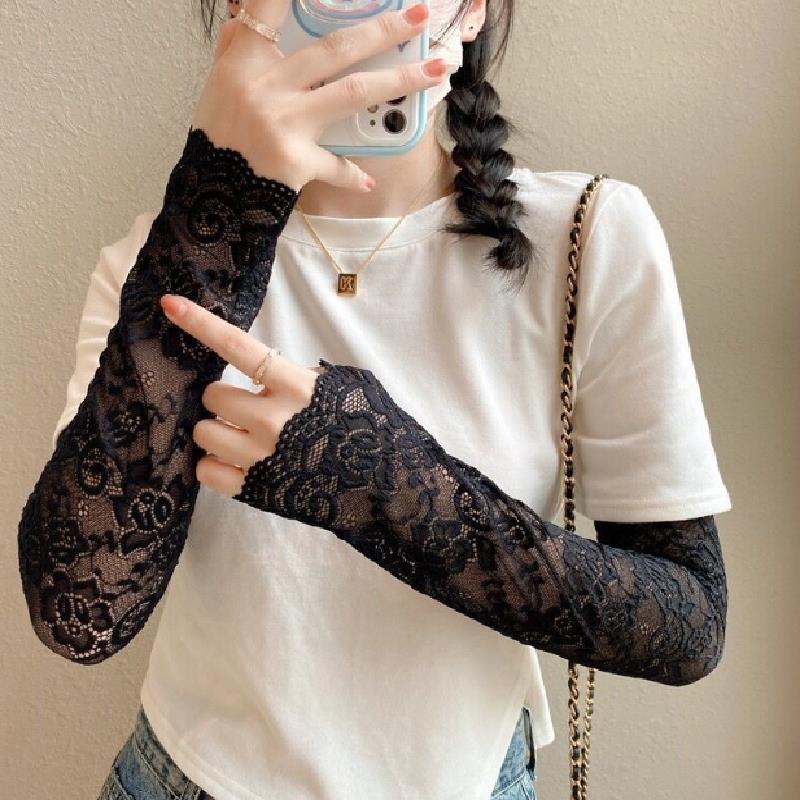 Women Summer Ice Silk Lace Arm Sleeve Elastic Sleeve Driving Gloves Black White Long Fingerless Mittens Sunscreen Gloves