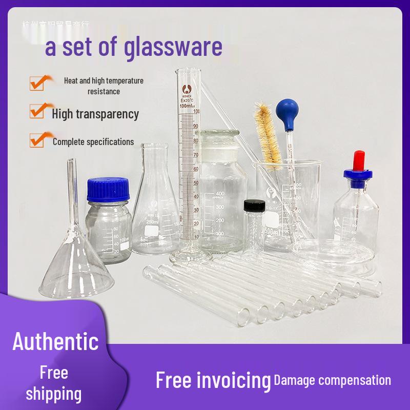 Zestaw szklanej kolby stożkowej z gumową główką, zlewką, zakraplaczem i probówką (50 szt)