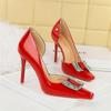 Fashion Western Style Party Super High Heels Pumps Patent Leather Shallow Mouth Square Toe Metal Crystal Buckle Lady Single Shoes Red
