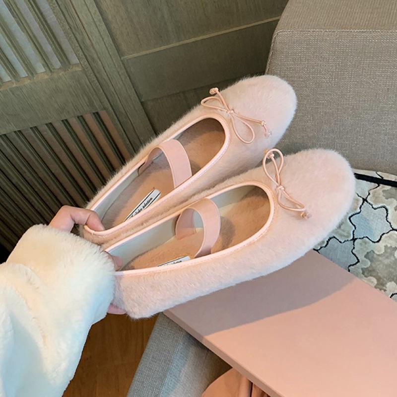 Modne Słodkie Futrzane Baleriny z Kokardką Kobiety Futrzane Baletki Zimowe Płaskie z Okrągłym Noskiem Damskie Ślubne Buty Ślubne Do Tańca Mokasyny Mujer