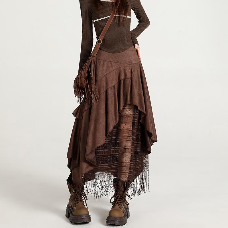 Women's High Waist Lace Patchwork Suede Midi Skirt, 2025 Autumn/Winter