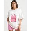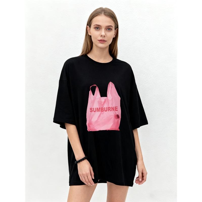 Oversize T-shirt Czarny Różowy Nadruk Torby Plastikowej Z Napisem SUMBURNE Swobodny Styl Uliczny