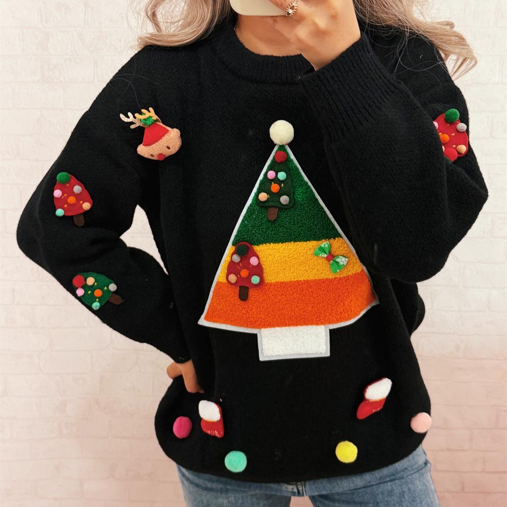 Damski Modny Świąteczny Sweter z Długim Rękawem z Okrągłym Dekoltem