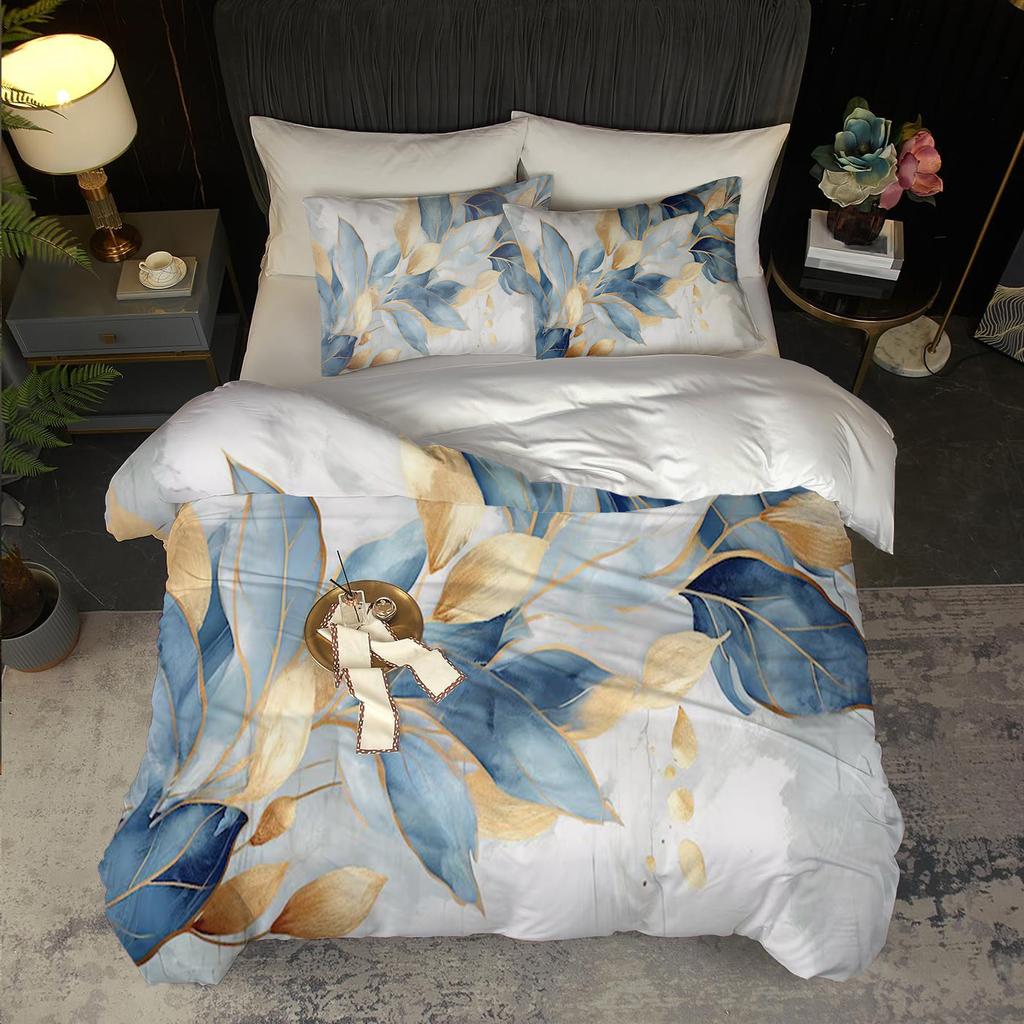 Blue And Gold Leaf Pattern 3D Printed Down Duvet Cover Bedding Set Soft And Comfortable Luxurious Duvet Cover Pillowcase