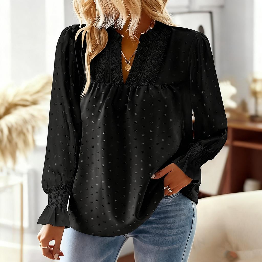 Damska wygodna luźna modna i codzienna bluzka z falowanym dekoltem, koronką i kropkami