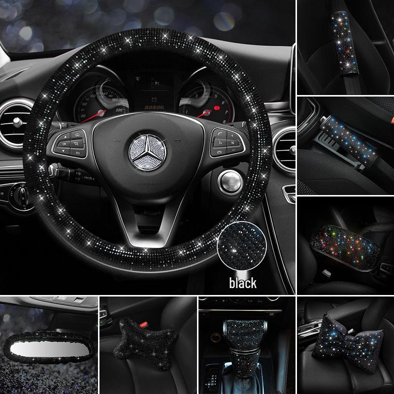 Zestaw do dekoracji samochodu z czarnymi diamentami: Pokrowce na kierownicę i uchwyty