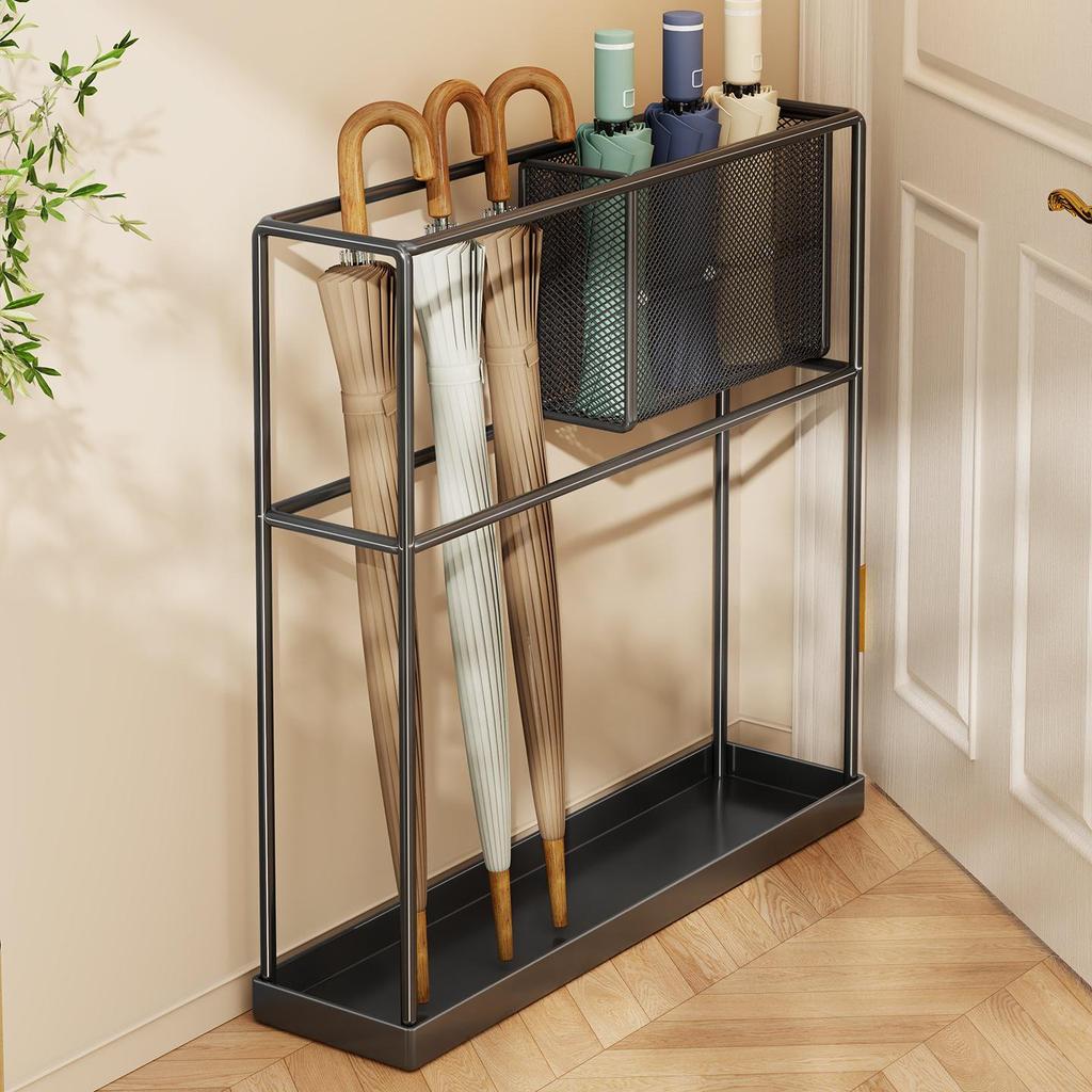 Stojak na parasole z kutego żelaza: Smukły stojak do przechowywania w drzwiach z półką ociekową