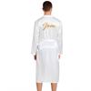 Zanurz się w luksusowym komforcie dzięki temu wykwintnemu męskiemu szlafrokowi ślubnemu porannemu. Ten długi szlafrok o dużym rozmiarze, wykonany z gładkiej satyny, jest idealny na rześkie wiosenne i jesienne poranki.. Jego elegancki złoty napis dodaje mu wyrafinowania, czyniąc go wyjątkowym elementem na każdą specjalną okazję.. Dzięki wszechstronnemu krojowi kardiganu, ta koszula nocna zapewnia zarówno styl, jak i komfort, oferując idealne połączenie ciepła i przewiewności.