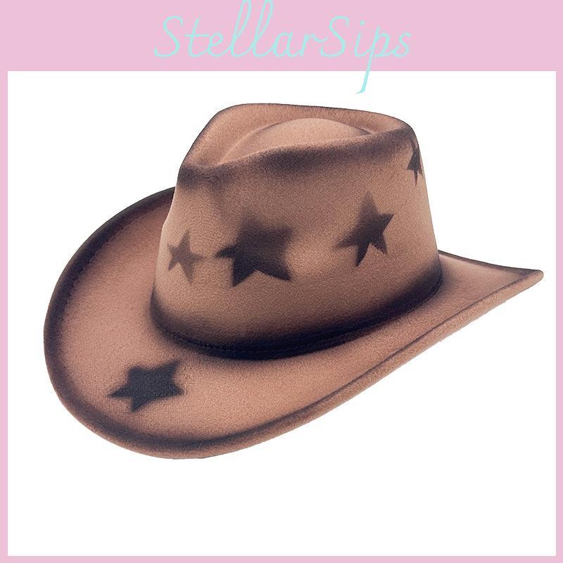 This cowboy hat features a wide brim and pinched crown, crafted from polyester wool blend for durability and breathability. Measuring approximately 22 inches in circumference size M: 56-58cm, it offers sun protection and insect resistance. Ideal for outdoor activities, it combines western style with artistic accents like star spray paint. Wipe clean with a damp cloth to maintain its appearance.