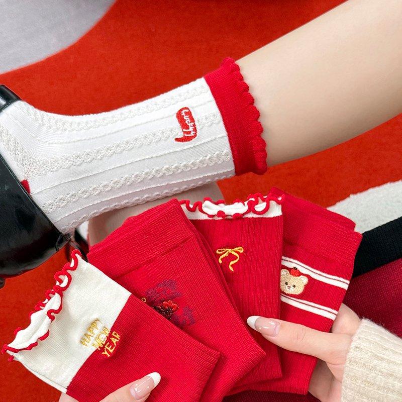 Lady Autumn and Winter New Year's Wedding Year Embroidered Lace Red Medium Tube Pile Pile Cotton Socks