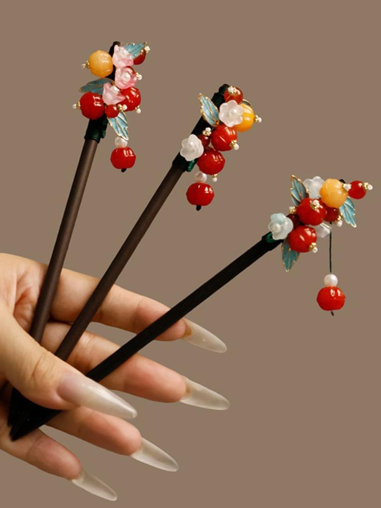 1pc Vintage Chinese Hair Sticks: Wooden with Colorful Beads,Flowers & LeavesAdd Elegant Oriental Charm to Traditional Outfits