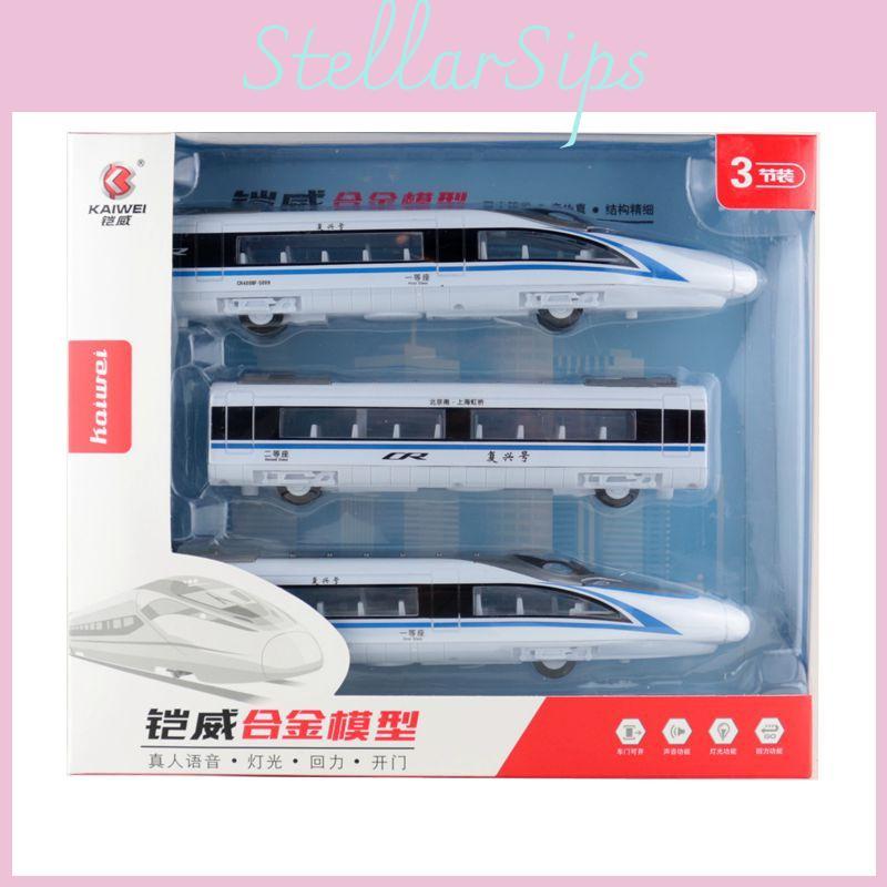 This three-piece alloy high-speed train model features opening doors and light effects, enhancing collection display. Made of durable alloy, each set measures approximately 68cm