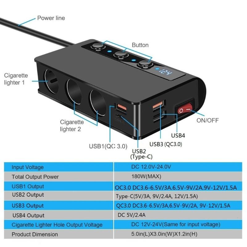 180W Car Charging Adapter Lighter Adapter Splitter Adapter USB Charger with Independent Switches and Voltmeter