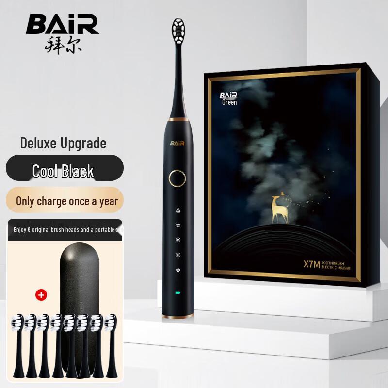 Experience superior oral care with the BAIR X7m Sonic Electric Toothbrush. Designed for adults, this toothbrush features DuPont bristles and provides three-dimensional cleaning with a single intensity setting. It boasts an impressive battery life of over 180 days on a single charge and convenient USB charging. This luxury gift set includes the toothbrush, a portable travel case, a charging cable, and 8 oval brush heads, making it perfect for personal use and travel.