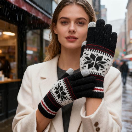 Świąteczny projekt świąteczny: Te rękawiczki, ozdobione klasycznymi motywami świątecznymi, takimi jak płatki śniegu w jasnych, żywych kolorach, dodają stylowego i świątecznego akcentu Twojej zimowej garderobie.. Idealne jako sezonowy dodatek modowy, rozjaśniają każdy strój i podkreślają radosnego ducha świątecznych uroczystości.