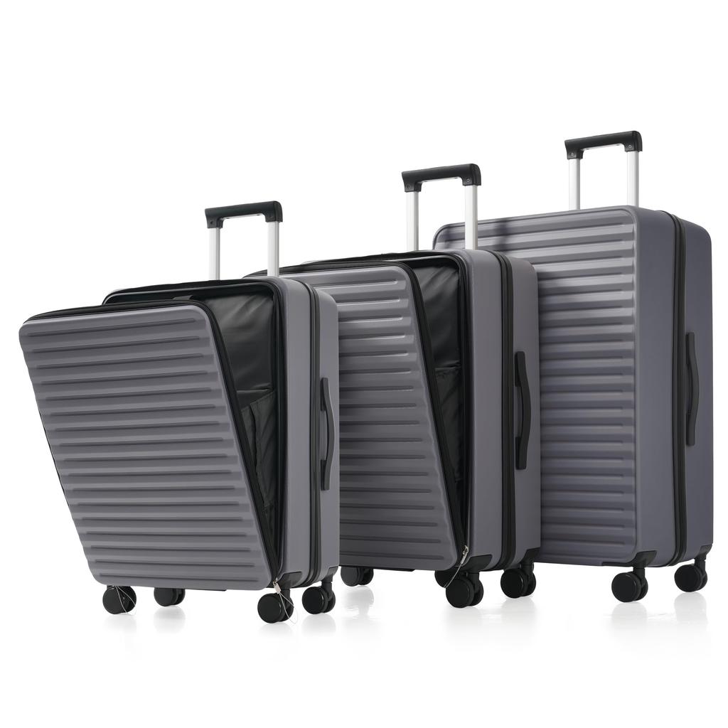 Zestaw walizek 3-częściowy Twarda skorupa, rozszerzalny, Wózek Otwieranie z przodu, Zamek TSA, 4x Kółka 360°, Uchwyt teleskopowy, Składany uchwyt na kubek, Antyczny szary