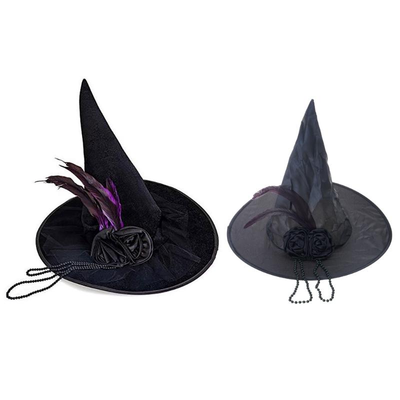 Halloween Party Velvet Witch Hats Party Wide Brim Pointed Hat Accessory Black Witch Hat with Chain Conjurer