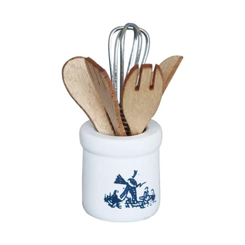 Ten zestaw kuchenny do domku dla lalek zawiera łopatkę, sztućce i słoiki, prezentując ręcznie rzeźbioną teksturę dla wizualnej i dotykowej autentyczności w scenerii domku dla lalek.