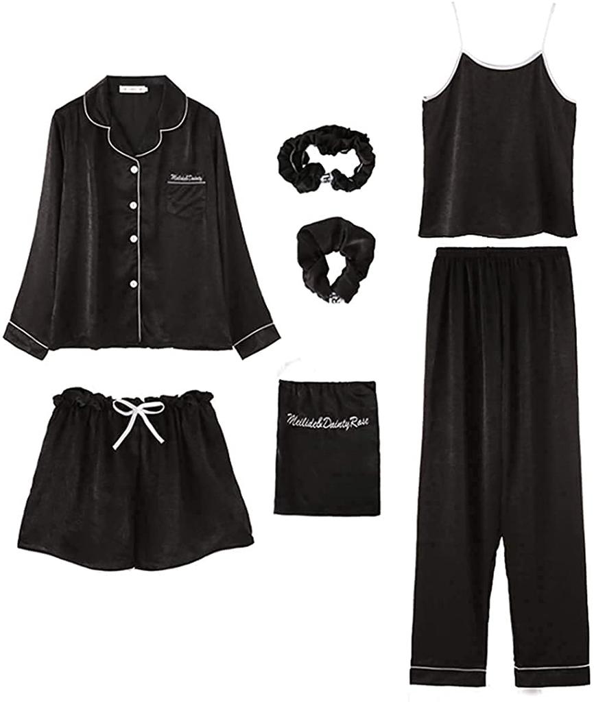 Set includes: 1. Camisole, 2. Long-sleeved shirt, 3. Shorts, 4. Long pants, 5. Hair ring, 6. Eye mask, and 7. Storage pocket. This luxurious 7-piece set will satisfy you and can be combined in various ways to suit the changing seasons. It can be used throughout the year, from spring to winter.