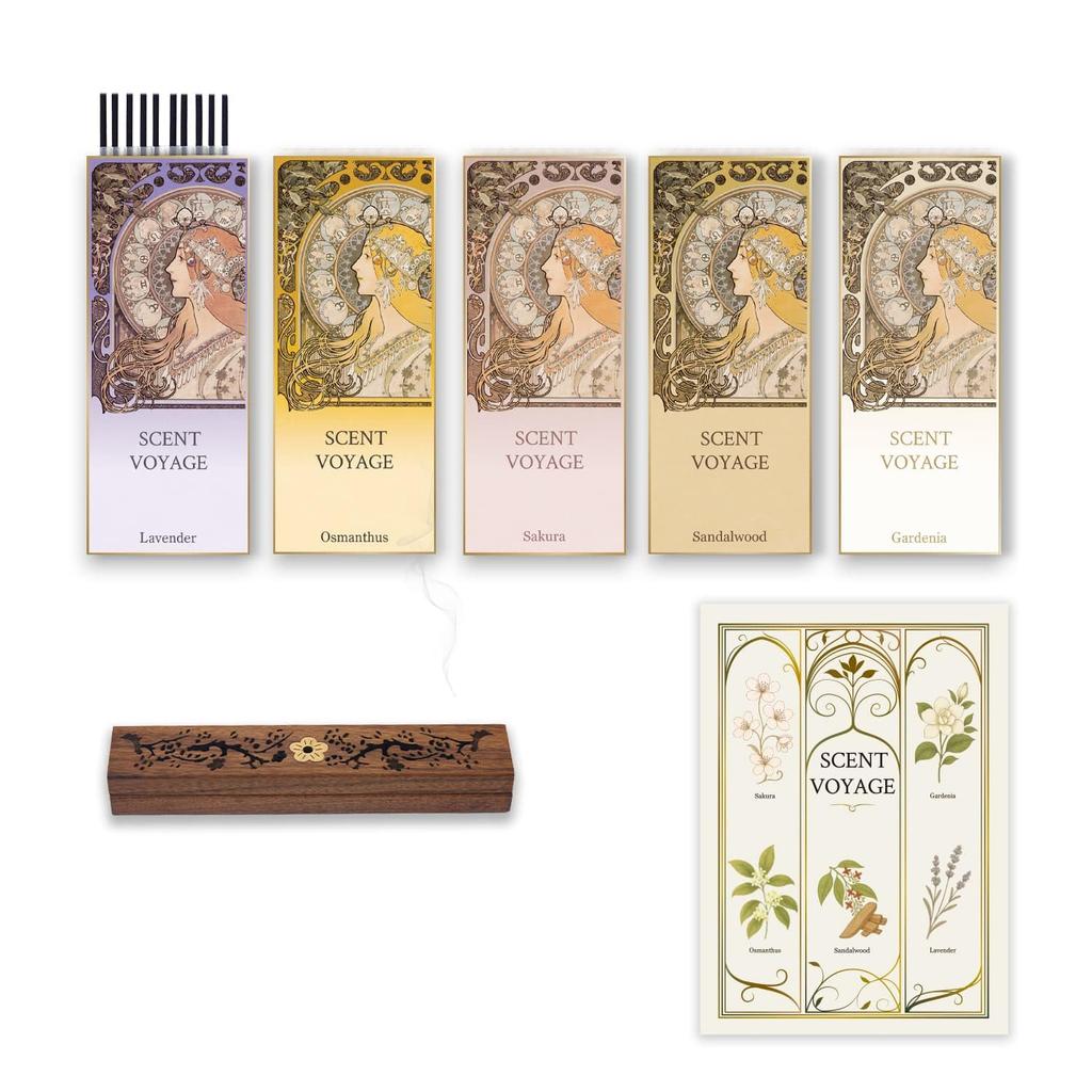 PODRÓŻ ZAPACHOWA: Zestaw kadzideł o niskim dymie z 5 zapachami, w tym drzewo sandałowe, osmantus i kwiat wiśni. Wykonane w Japonii. Bezpopielniczkowy kadzielnica