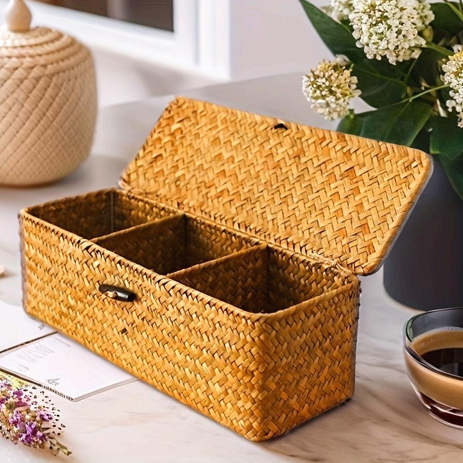 Chic Woven Storage Box with Lid - Organize Makeup & Desk, Stylish Home Decor!